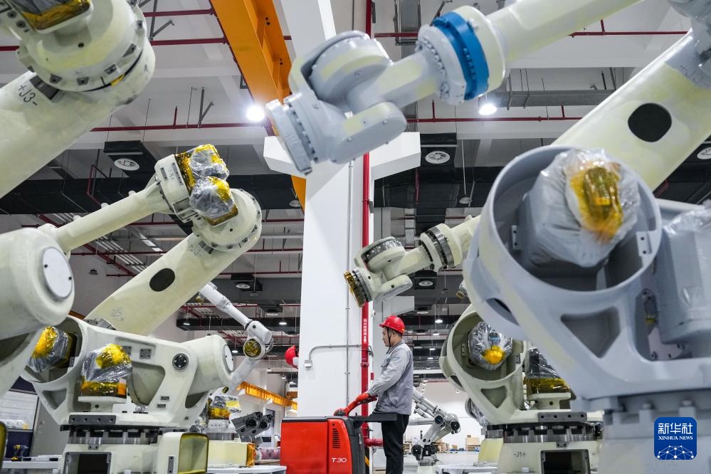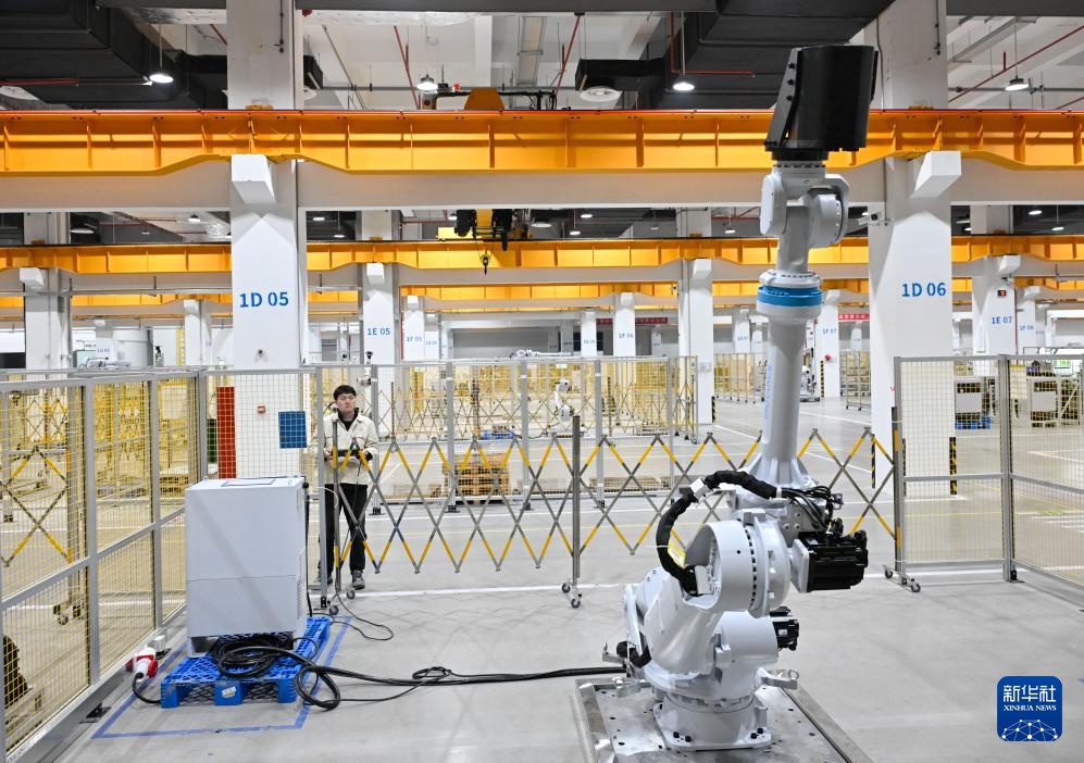 3月17日,在位于南京市江宁开发区的汇川技术南京基地自动化车间内,多关节机器人产线在进行出厂前测试。新华社记者 李博 摄