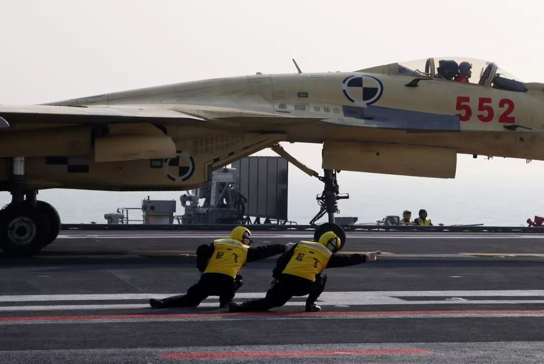 其实,“走你”这个动作并不是做给飞行员看的,而是给装备操作人员看的。这个动作意味着舰载机已达到可起飞的推力,要释放止动轮挡,让舰载机冲出甲板、飞向海天。